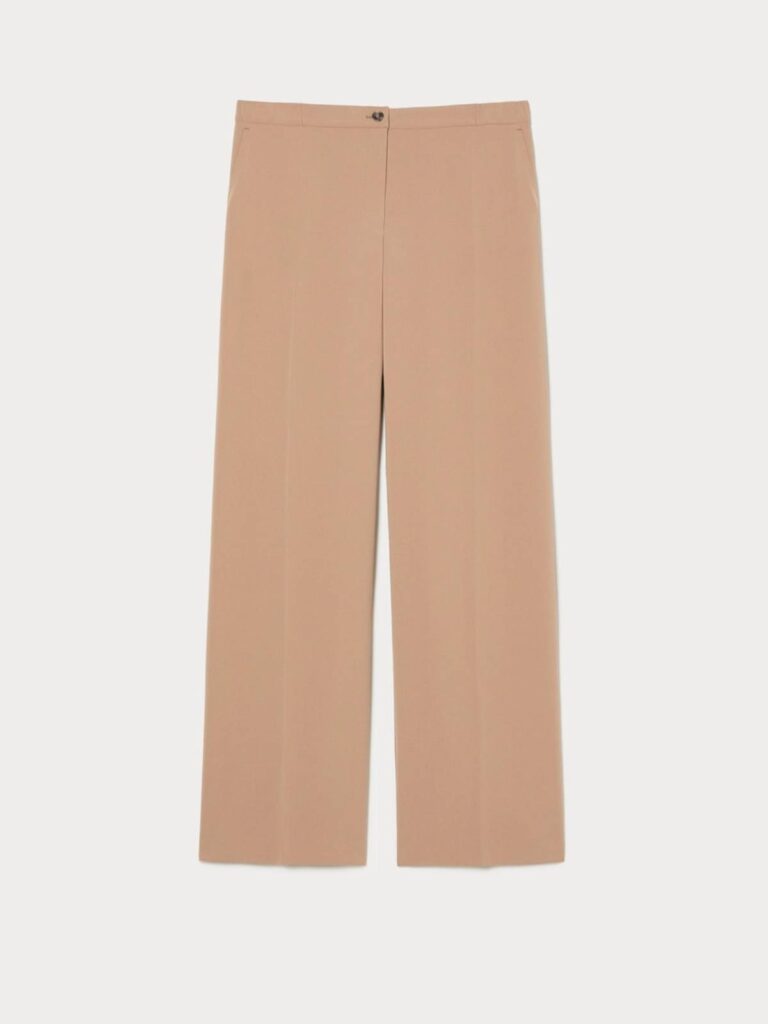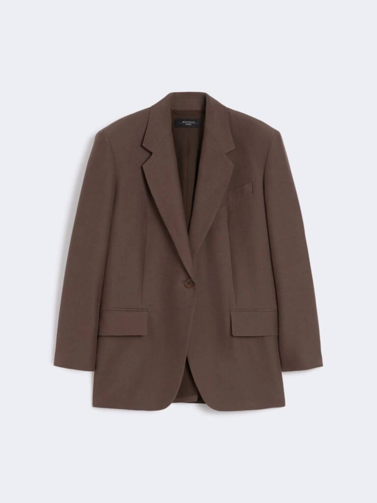 Kaamelipruun pintsak ja püksid loovad elegantse ja ajatu aluse, mida valge v-kaelusega topp kergelt tasakaalustab. Pruun käekott ja nahast mokassiinid lisavad riietusele luksusliku viimistluse, samas kui valge siidisall toob komplekti õhulisust ja kontrasti.