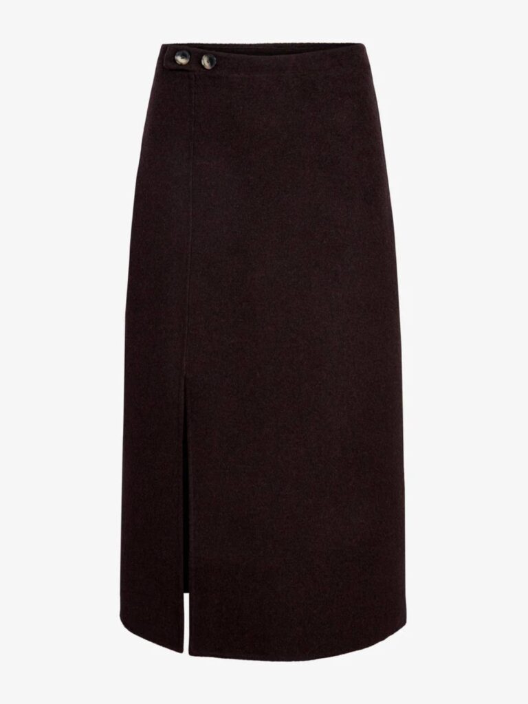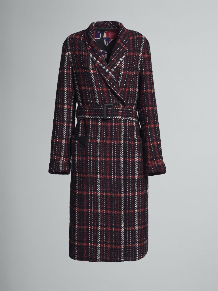 Punasekirju mantel toob riietusse julge ja mängulise aktsendi, samas kui sinine triiksärk lisab klassikalist ja ajatut joont. Tumepruun villane seelik tasakaalustab komplekti pehmuse ja tekstuuriga, must käekott ning kõrged mustad saapad lisavad elegantsi ja rafineeritust. Nahast kindad annavad riietusele viimase lihvi, luues terviku, mis on samaaegselt šikk, luksuslik ja hooajaliselt sobiv.