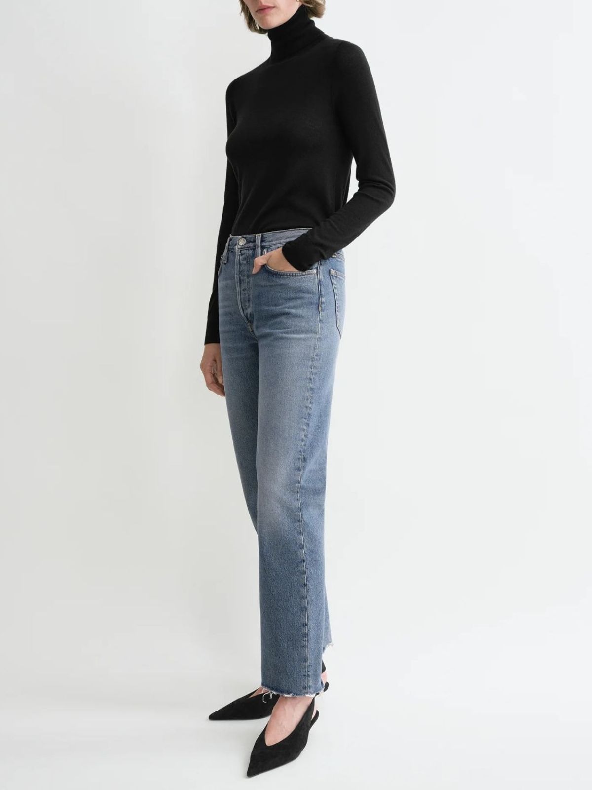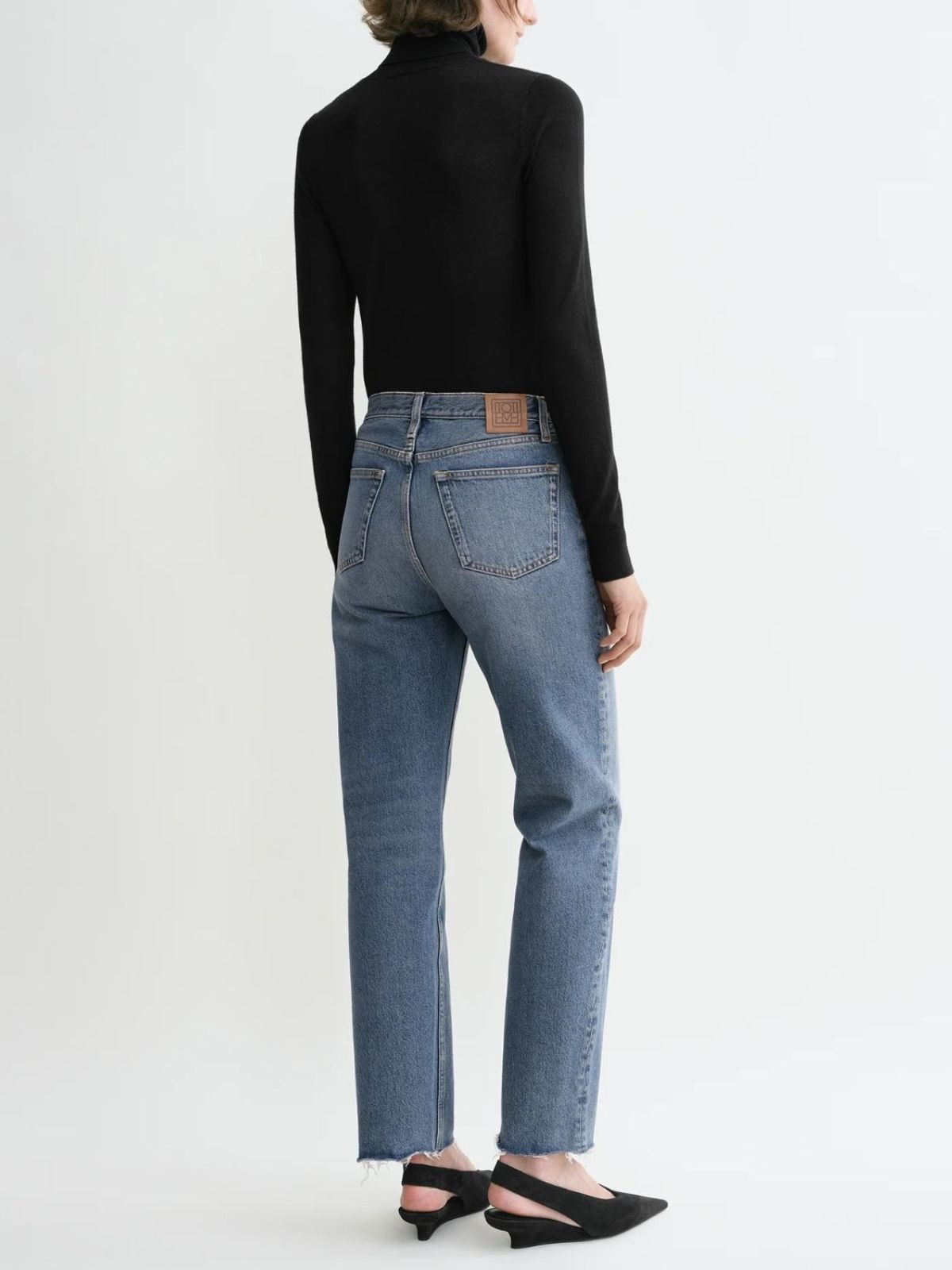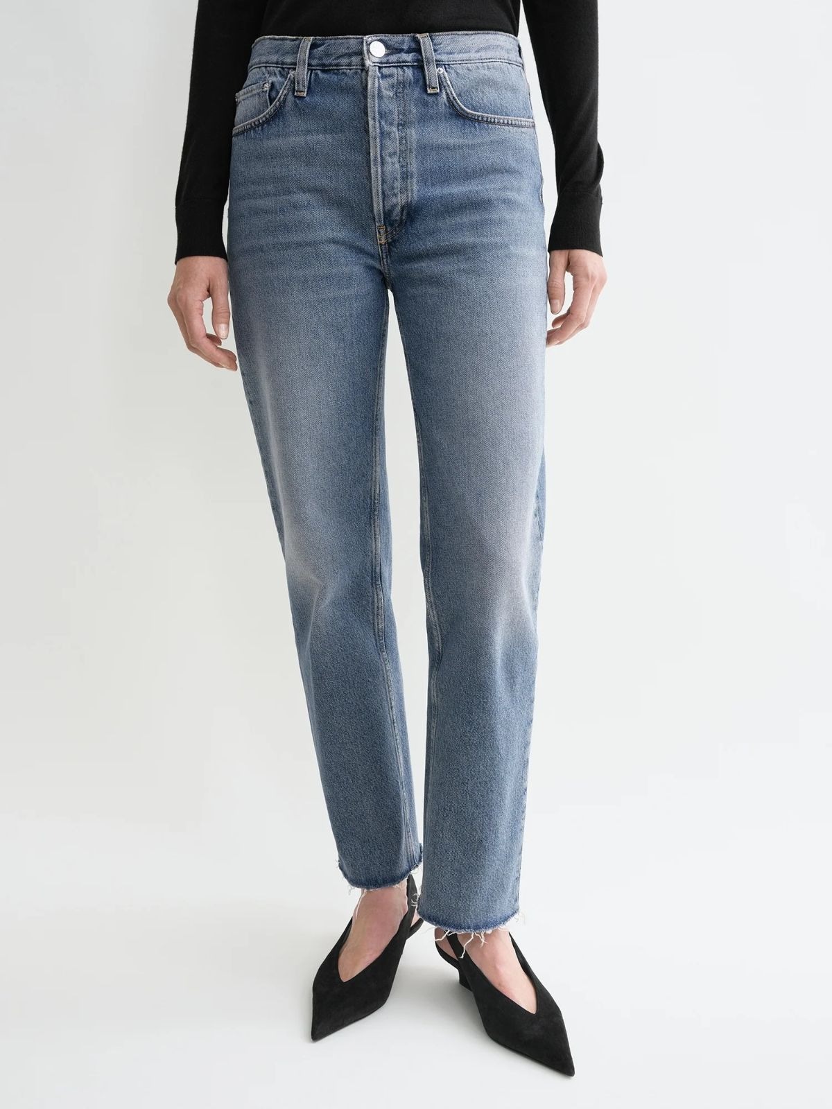 Toteme Classic Cut Denim teksapüksid on mitmekülgne garderoobiklassika - puuvillasest kangast teksapükstel on keskmise kõrgusega värvel, slim-straight tegumood, vööaasad, nööpkinnitus ja tõmblukk. Pükstel on viimistlemata alläär.