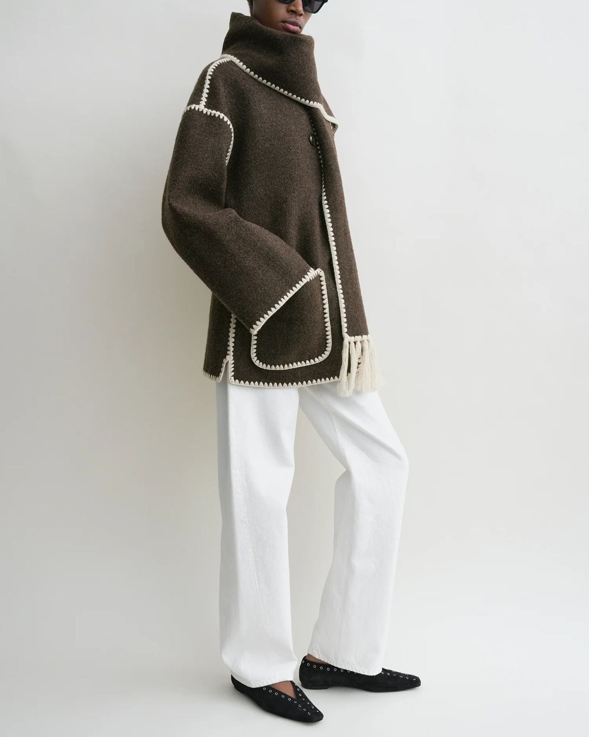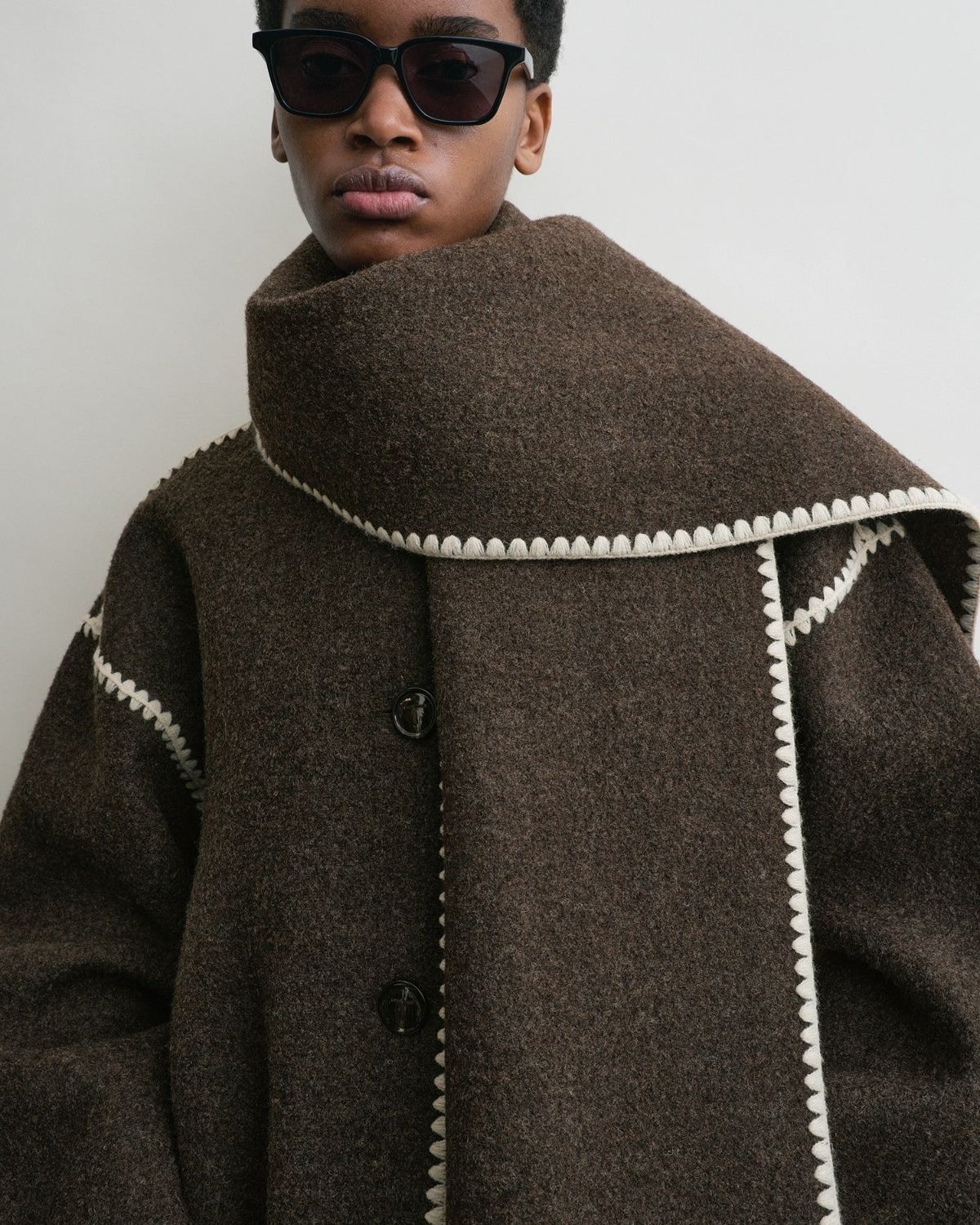 Unikaalse disainiga jakk on valmistatud raskest villasegusest kangast ning sellel on modernselt oversized lõige, mida täiustavad madaldatud õlad, laiad lõhikutega varrukad ja suured eesmised taskud. Jaki signatuur-detail on aga selle külge õmmeldud samas värvitoonis sall, mida kaunistavad kontrastsed ääristused ja narmad.