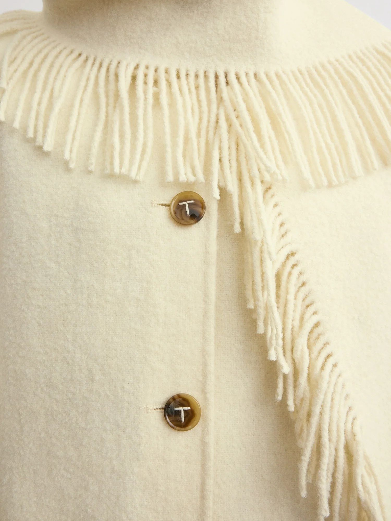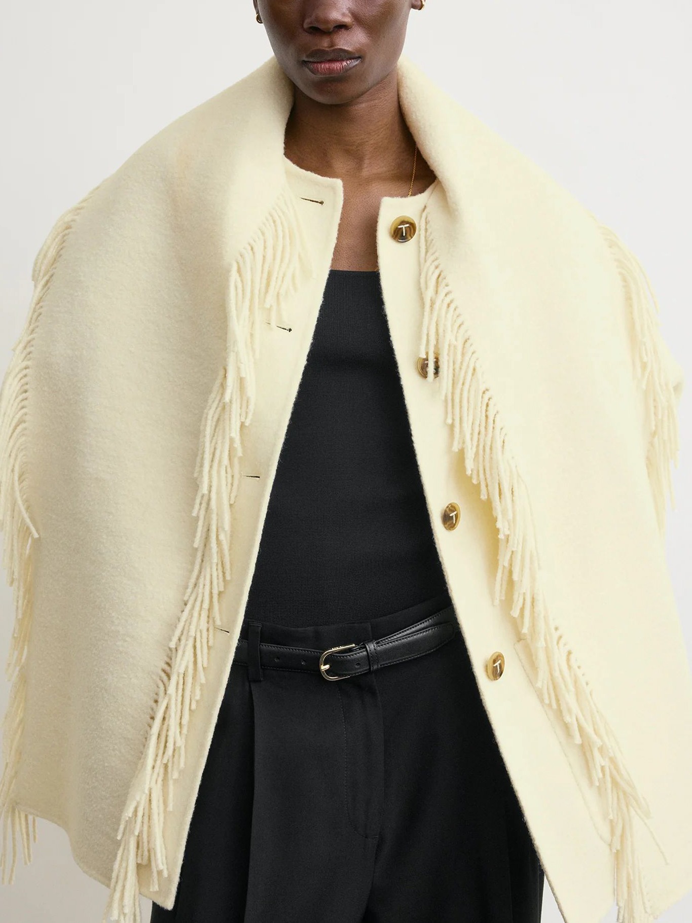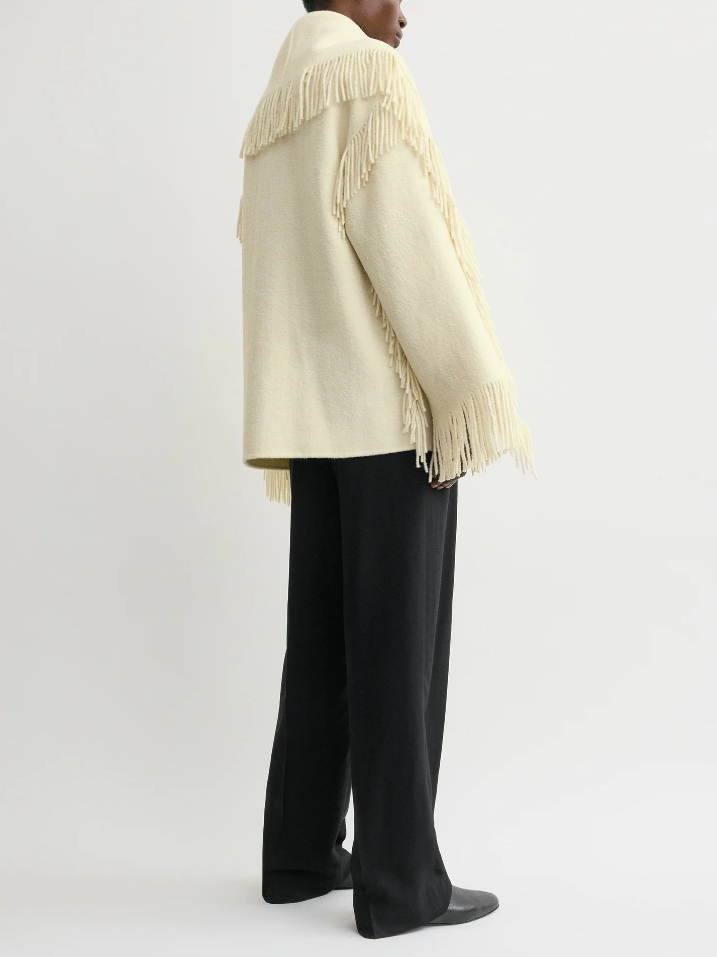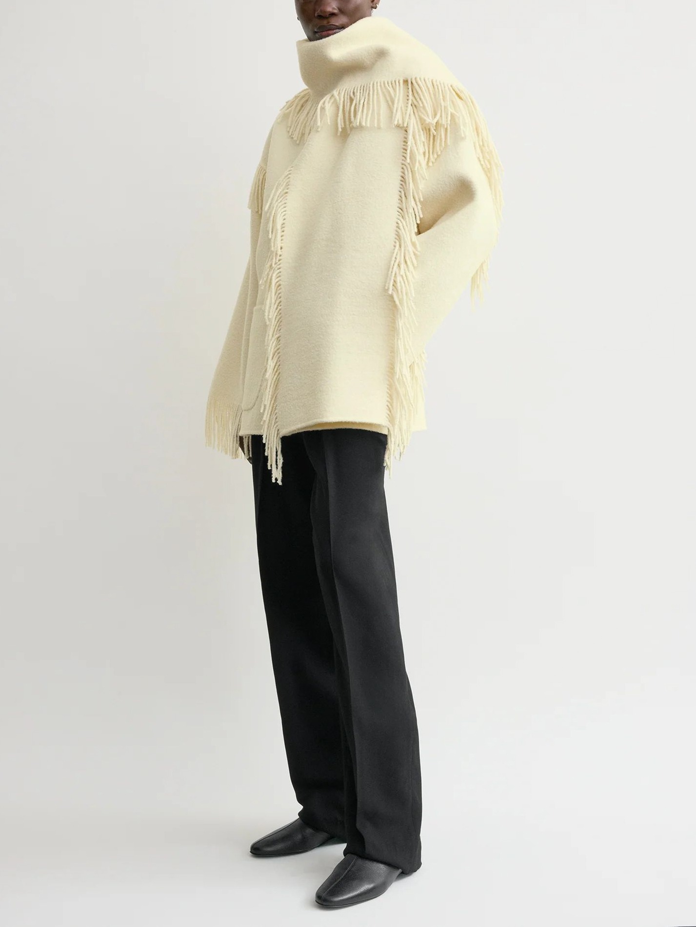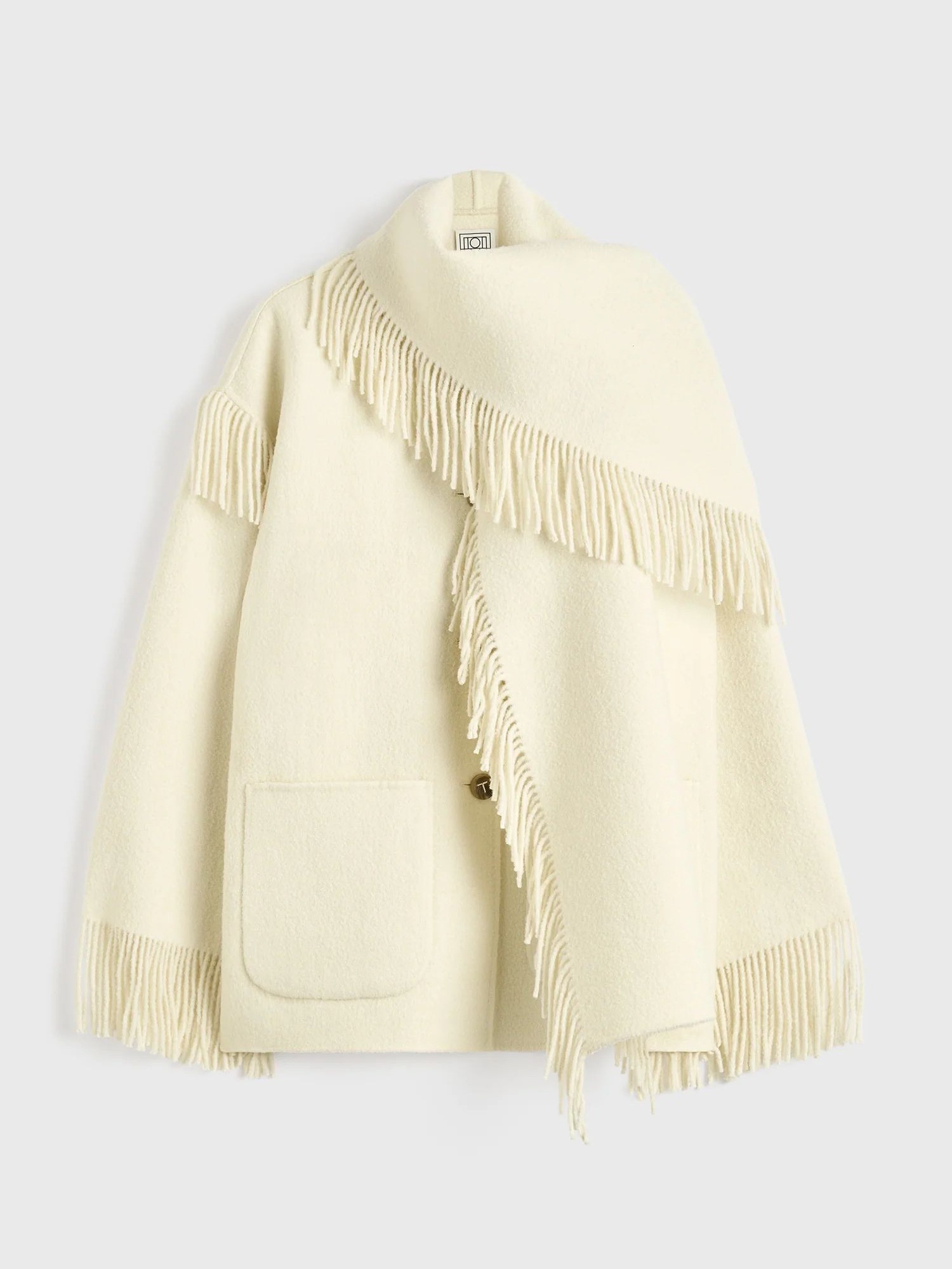 Toteme Fringed Scarf Jacket sall-jakk on uuenduslik versioon brändi ühest kuulsaimast disainist - unikaalne jakk on valmistatud raskest villasegusest kangast ning sellel on modernselt oversized lõige, mida täiustavad madaldatud õlad, laiad lõhikutega varrukad ja suured eesmised taskud. Jaki signatuur-detail on aga selle külge õmmeldud samas värvitoonis sall ning pikad narmad käistel, salli äärtes ja õlgadel.