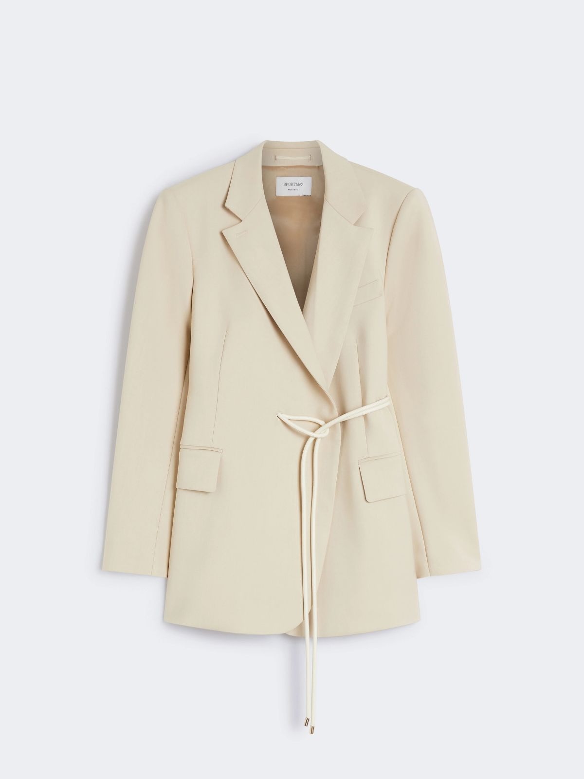 Sportmax Glassa pintsak on ülimalt šikk - viskoosisegusest kangast pintsakul on wide fit tegumood, reväärkrae, küljetaskud ning nahaimitatsioonist pihavöö. Sobita Fetta viigipükstega ning loo pilkupüüdev komplekt!