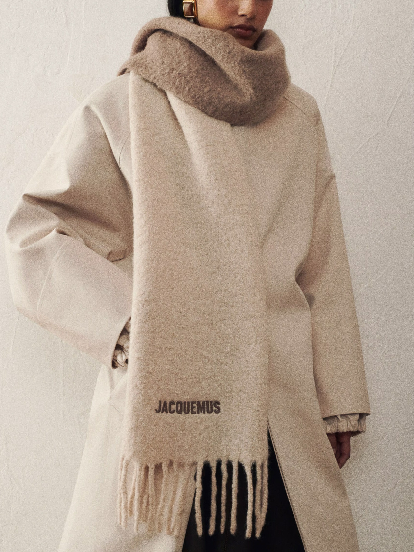 Jacquemus L'echarpe Moisson sall on stiilne ja soe aksessuaar sügistalvisesse garderoobi - pehmest villasegusest materjalist salli kaunistab brändi tikitud logo. Sallil on narmad.