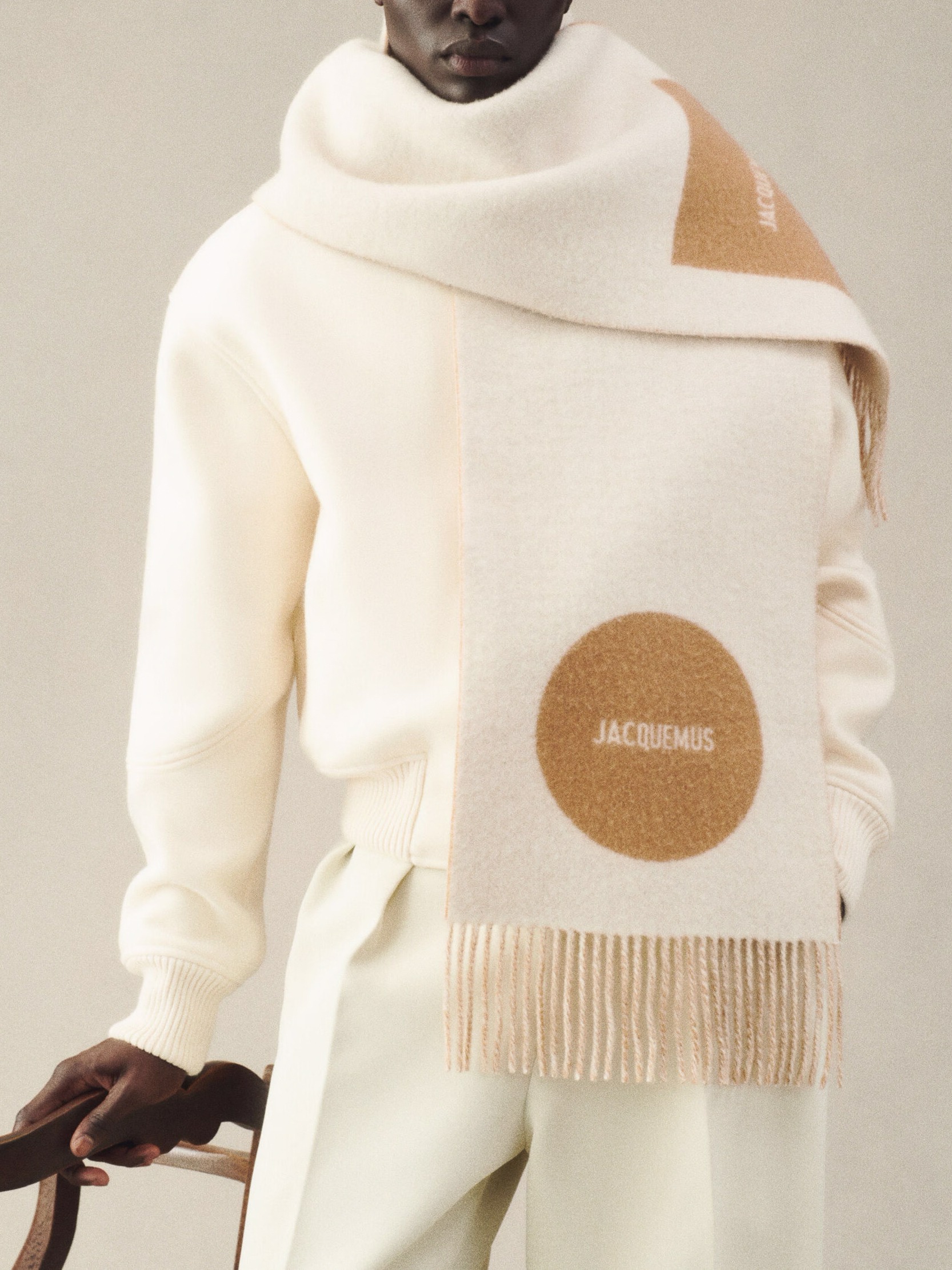 Jacquemus L'echarpe Rond Carré sall on maitsekas ja ülimalt praktiline - uusvillasest lõngast salli kaunistavad kontrastsed ruudu- ja ringikujulised logod ning salli otsi ääristavad pikad narmad.
