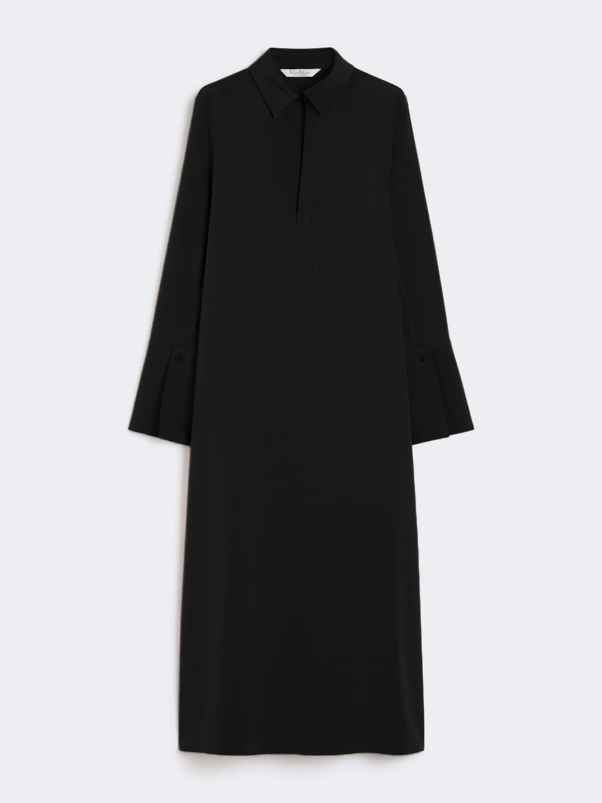 Max Mara Ossola kleit on elegantne ja ülimalt luksuslik - siidikangast kleidil on alt laienev siluett, polostiilis kaelus, pikad laiade ning nööbistatud käistega varrukad ja küljetaskud.