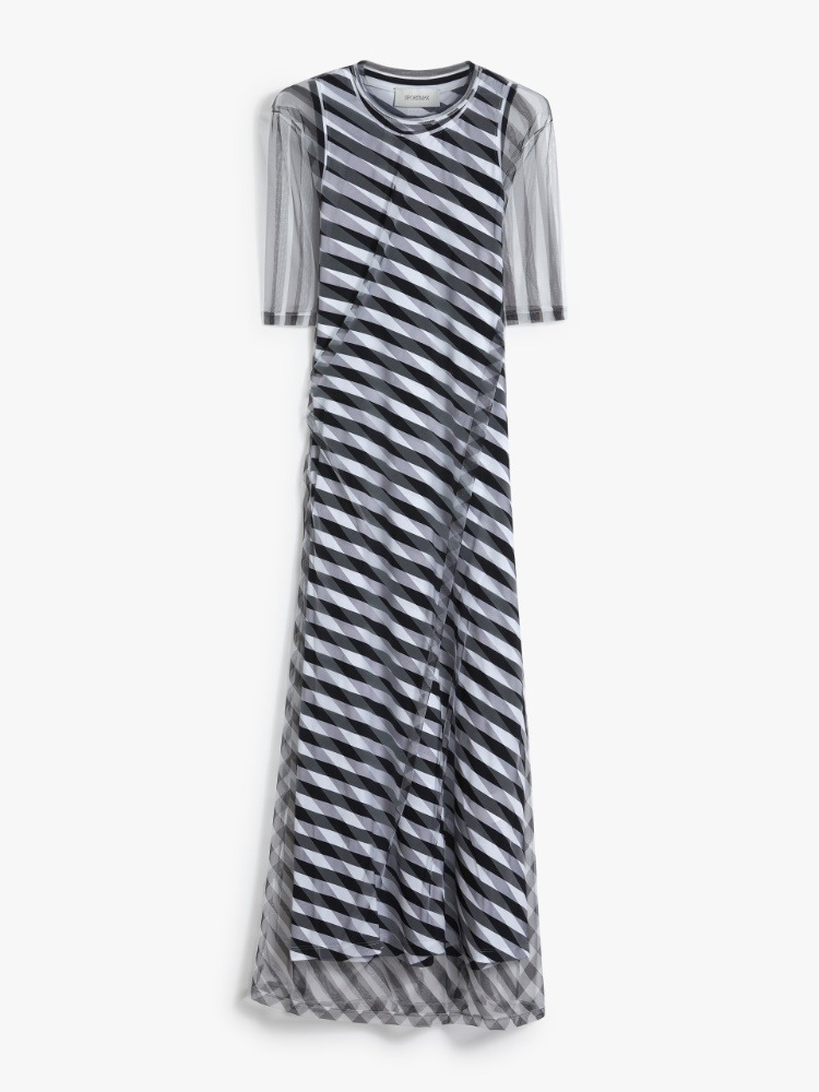 Sportmax Pausa triibuline kleit särab omanäolise ja pilkupüüdva disainiga - kaheosaline kleit on valmistatud venivast jersey-kangast ning sellel on liibuv aluskleit ja läbipaistev pealmine osa, millel on ümar kaelus ja lühikesed varrukad.