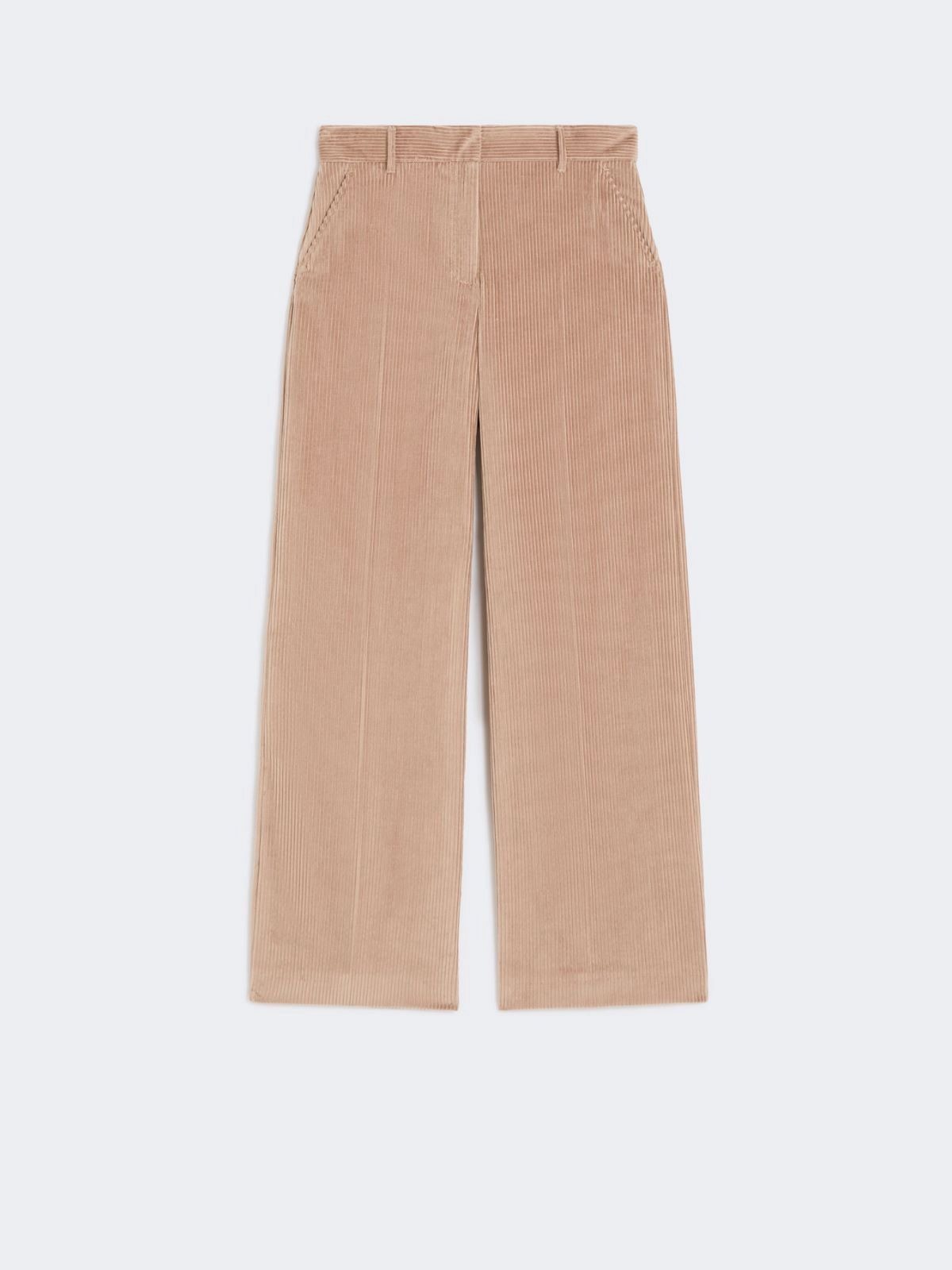 Weekend Max Mara Tania velvetkangast püksid võluvad stiilse värvitooni ja lihtsa tegumoega - puuvillasest velvetkangast pükstel on wide leg lõige, lai värvel, haakkinnitus ja tõmblukk, külje- ja tagataskud, vööaasad ning viigid.