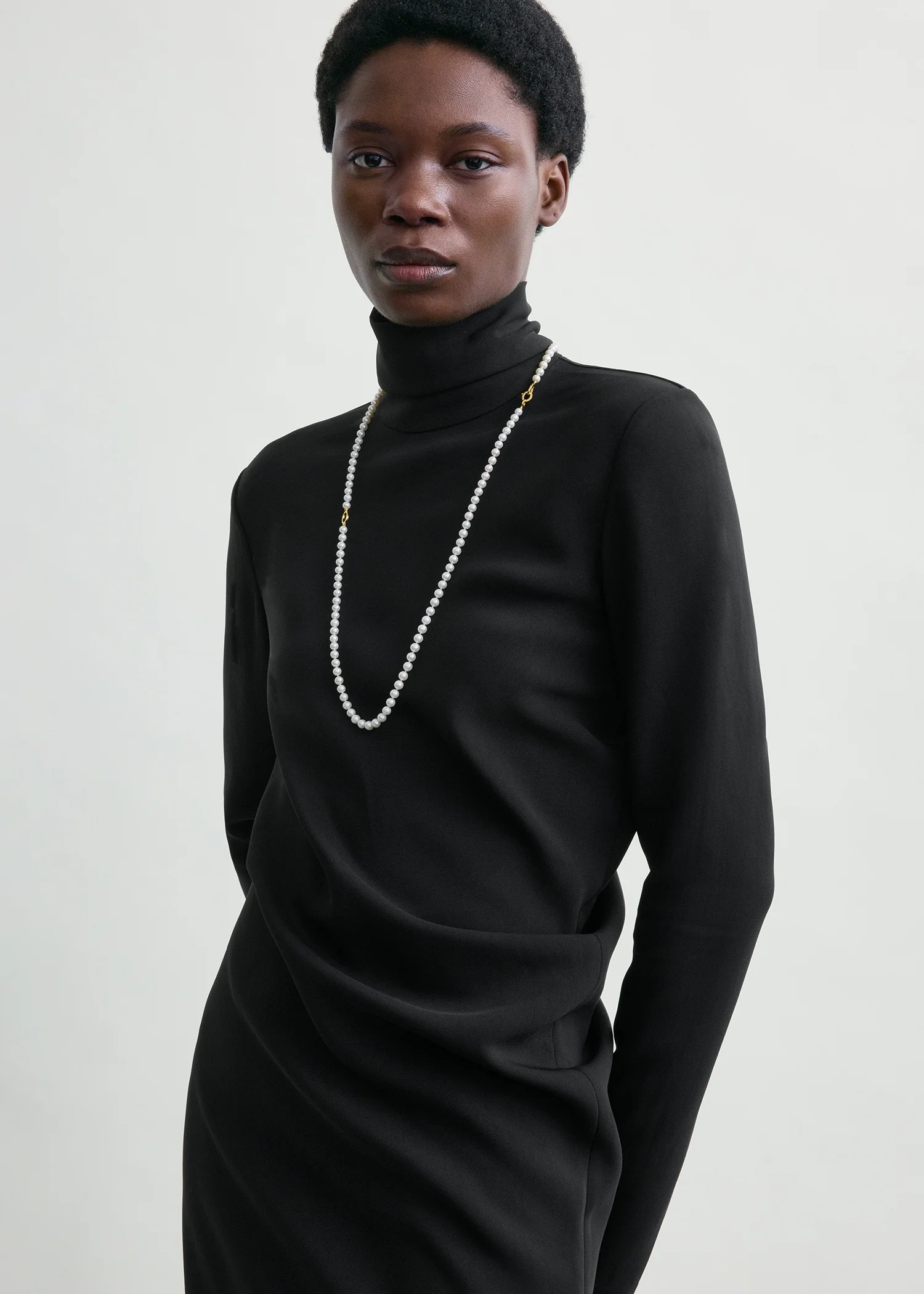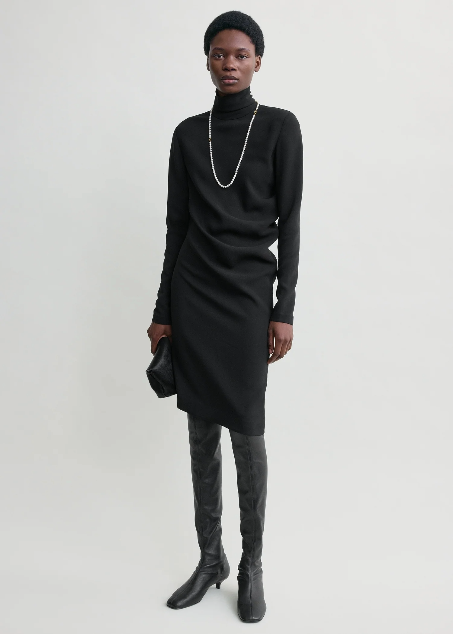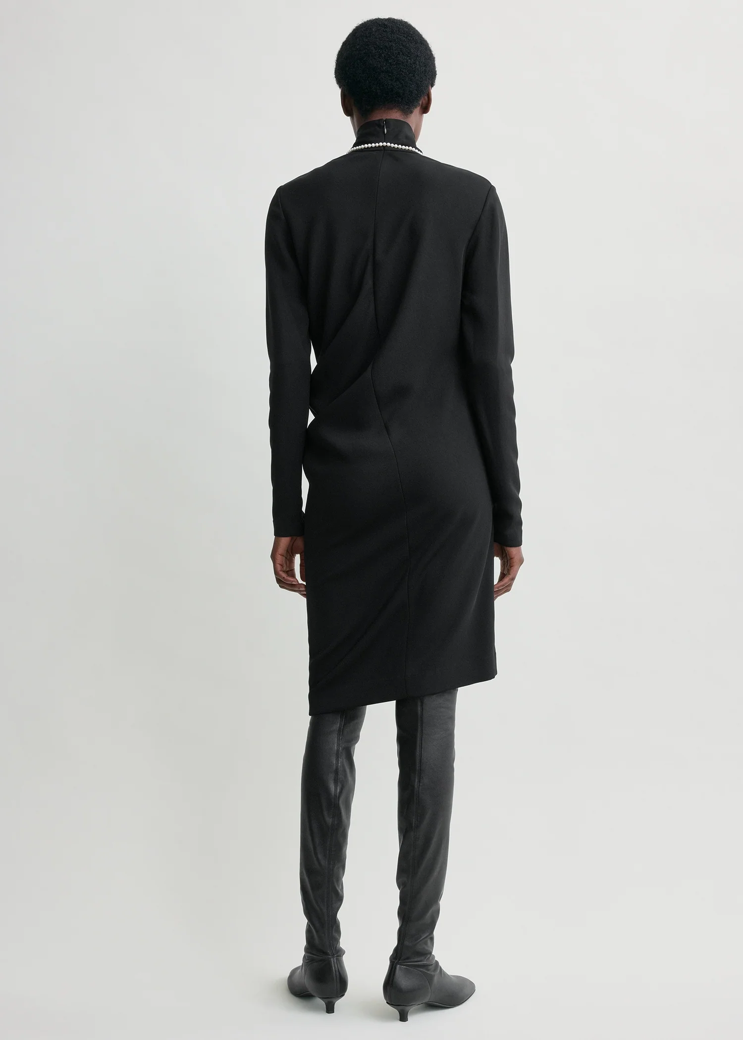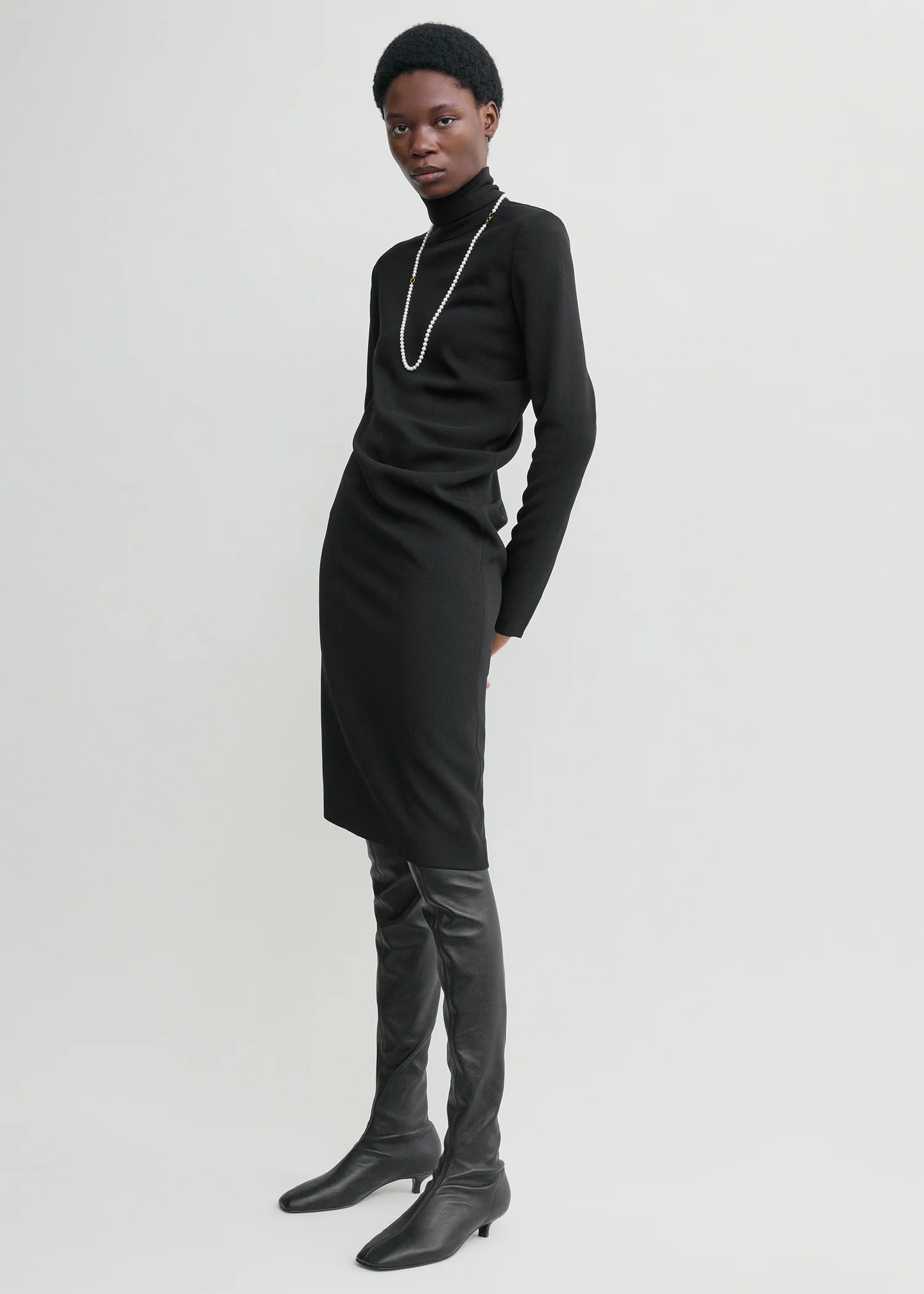 Toteme Twist Dress must kleit on ülimalt stiilne ning ühtlasi elegantne täiendus garderoobi - kõrge kaeluse ning pikkade varrukatega kleidile lisab omapärase efekti keerdsiluett. Kleit istub seljas vabalt ning kinnitub tõmblukuga seljal.