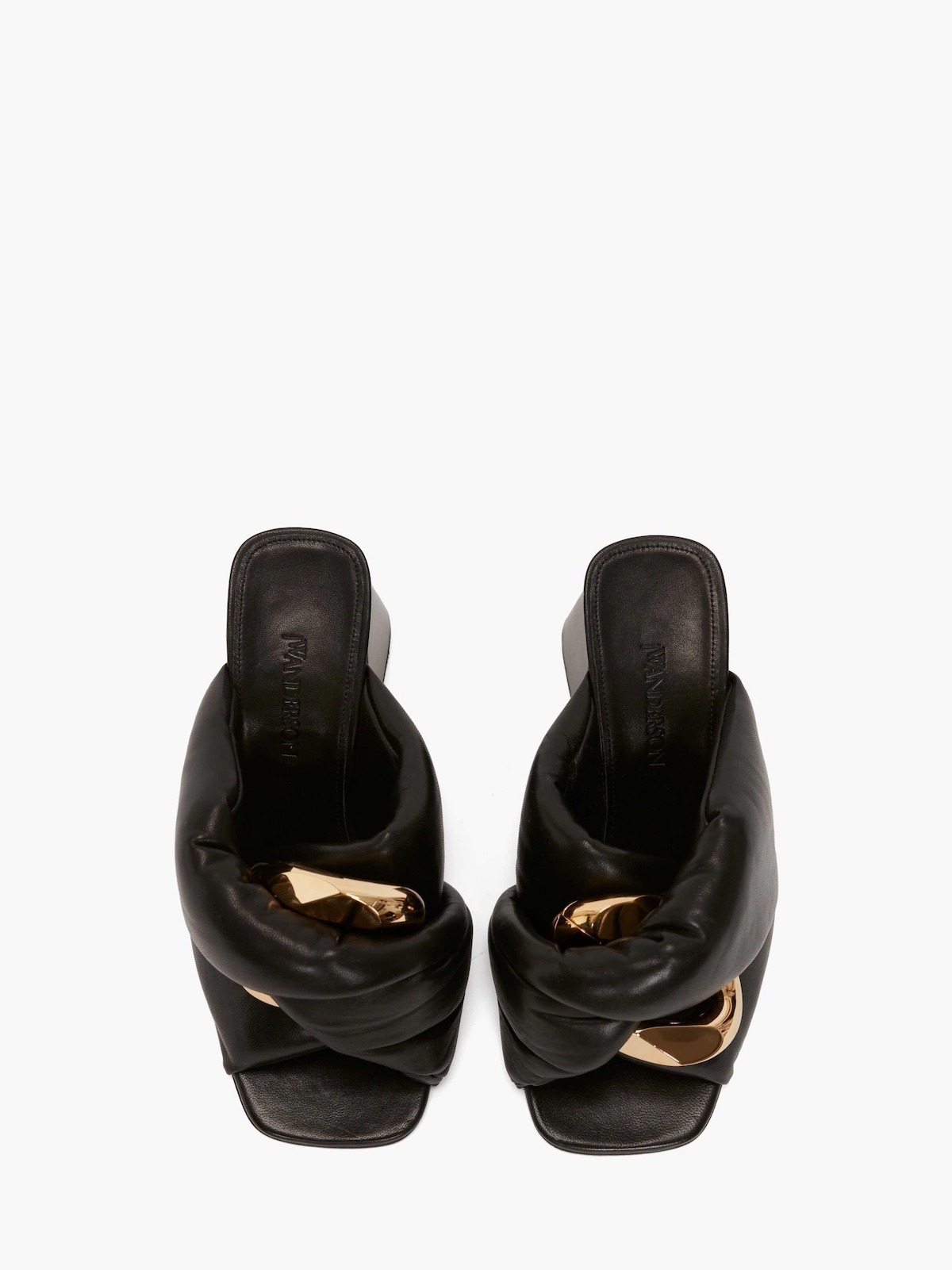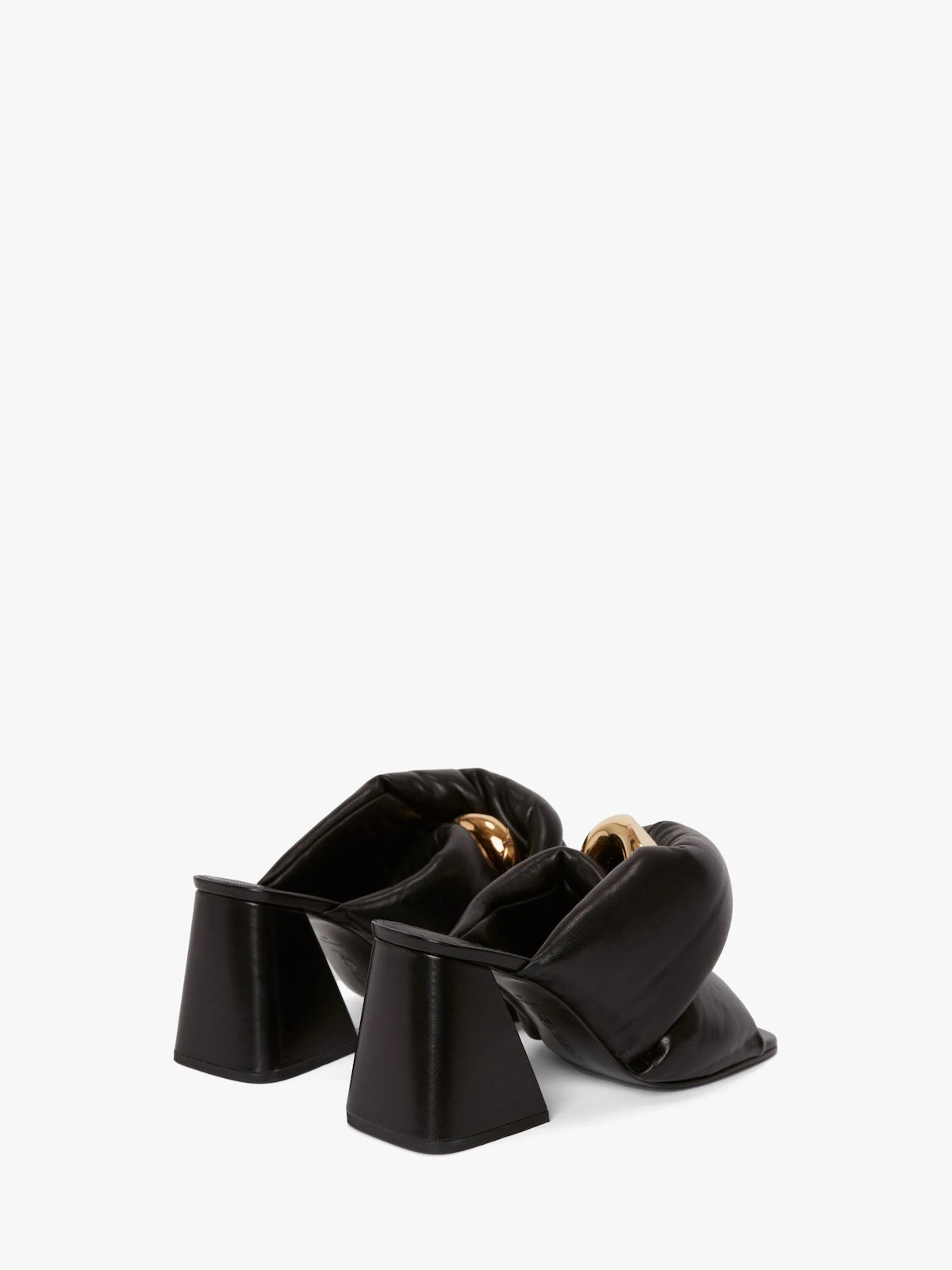 Nahast kõrge kontsaga kingad. Kuldse tooniga ketilüliga keerdus detailid. Pehme kandiline varbaosa.