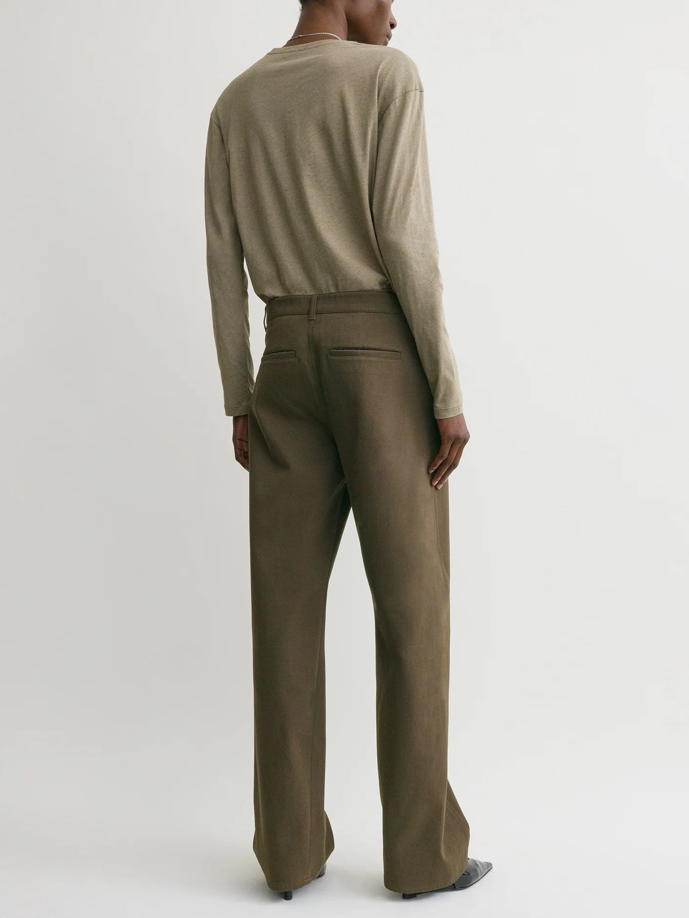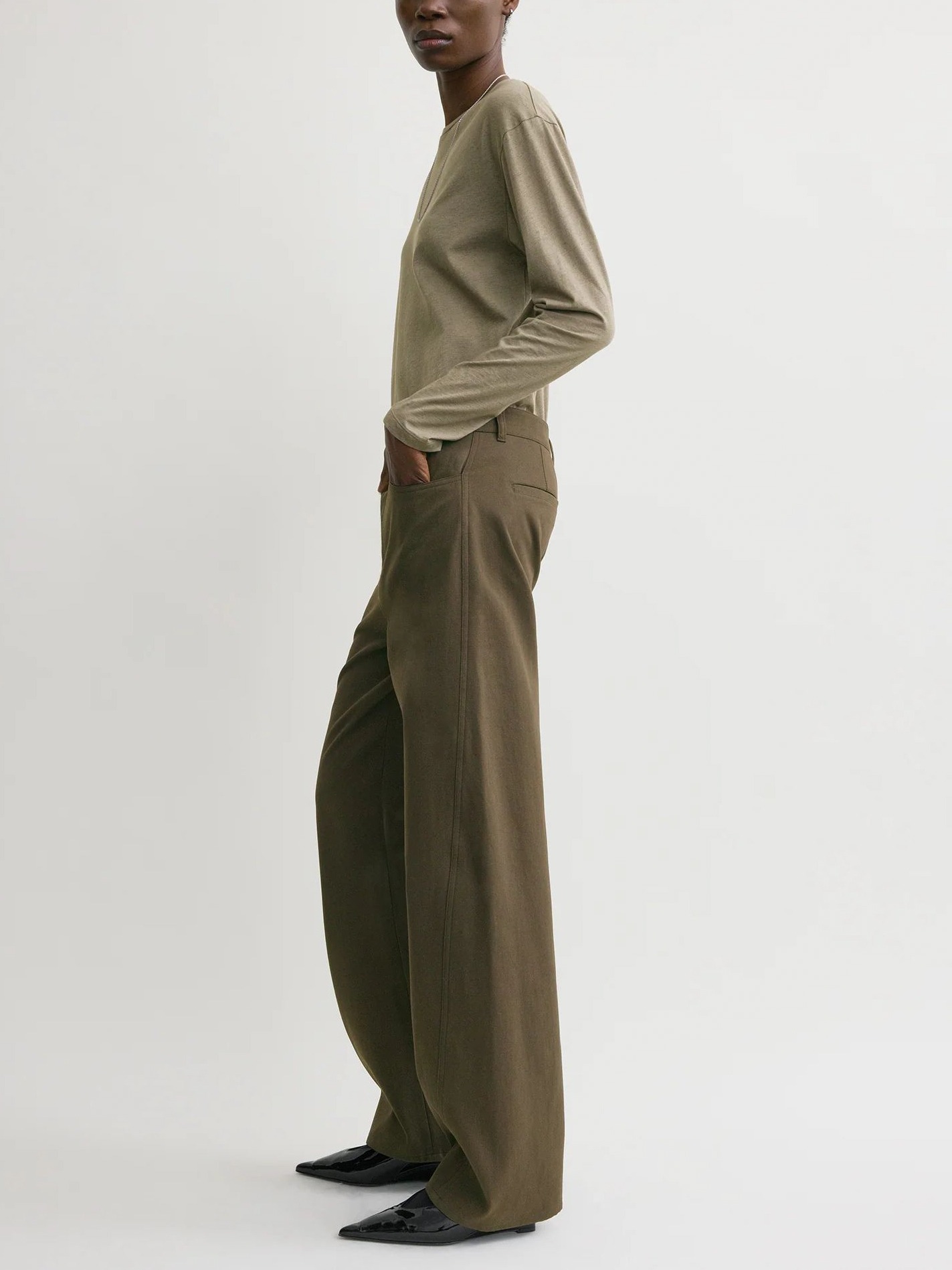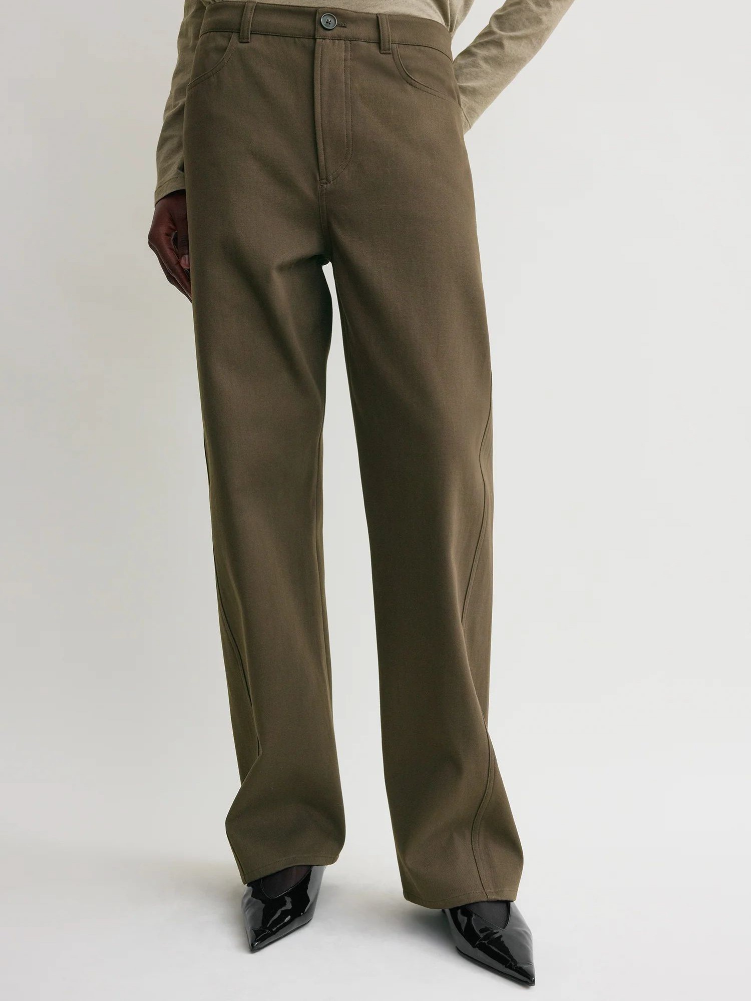 Toteme Twisted Tailored Trousers pruunid puuvillased püksid võluvad mitmekülgsuse, mugavuse ja stiilsusega - oversized tegumoega püksid on valmistatud pehmest puuvillasest kangast ning neil on külje- ja tagataskud, vööaasad ning tõmblukk ja nööpkinnitus. Pükstel on efektsed sissepoole keerduvad küljeõmblused.